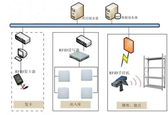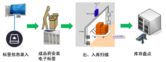 药品出入库时,使用固定式的读写器读取药品外包装上的电子标签信息,并根据读取到的信息和出入库数量信息一起上传到系统数据服务器,管理中心系统服务器根据种类信息进行归类统计,实时显示库存信息、库存位置信息、出库信息等,完善仓库管理中的工作。使用手持式读写器,可以对仓库的药品进行盘点。